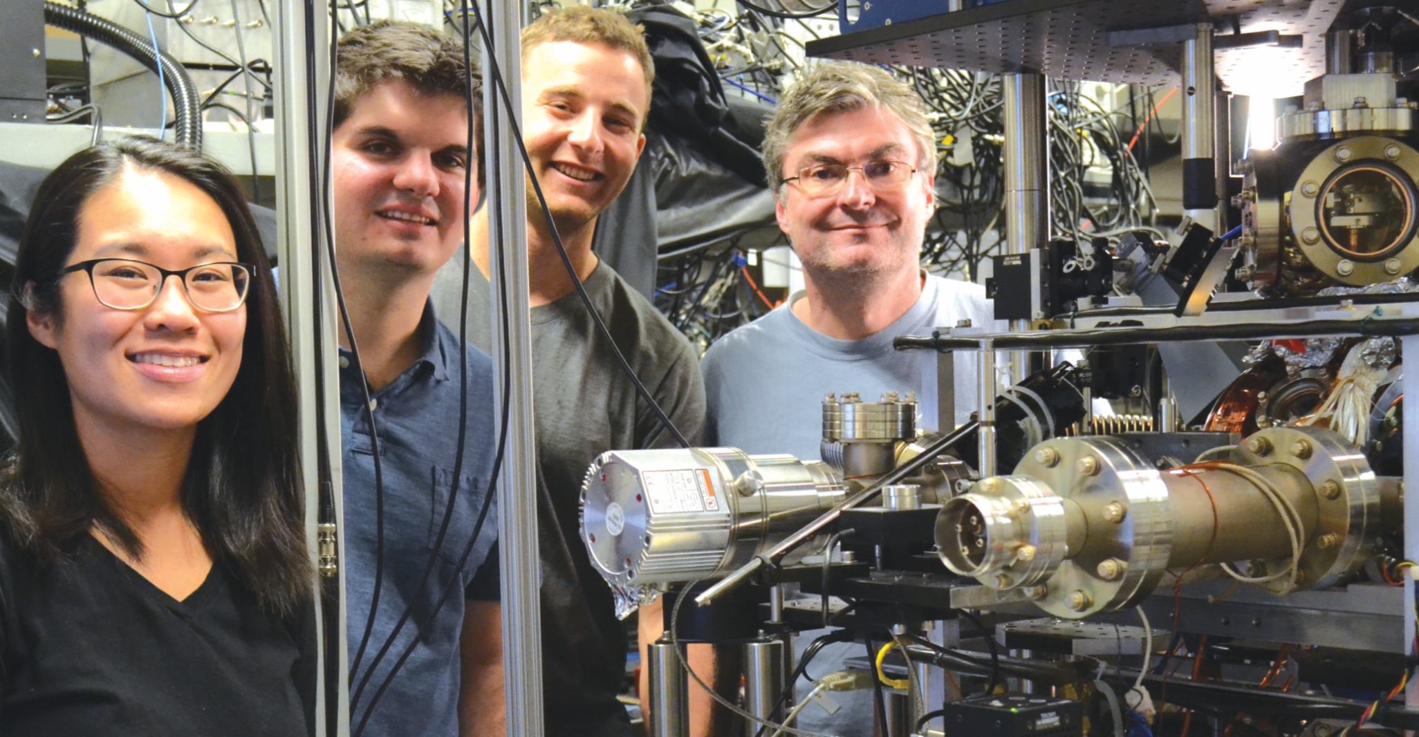 Holger Müller (right) leads the University of California, Berkeley, group of (from left) Victoria Xu, Cristian Panda, and Matt Jaffe, who developed and now run the atom interferometer. (Photo by Sarah Wittmer.)