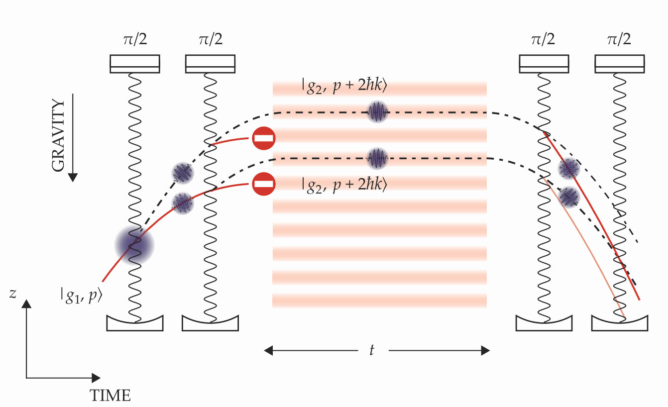 Four of those π/2 pulses accompany the atom cloud through the interferometer. The first pulse places each Cs atom into a coherent superposition of two states—one that receives a momentum kick and one that doesn’t. The two clouds form localized partial wavepackets traveling along distinct trajectories at different momenta, and the two trajectories form the upper and lower arms of the interferometer.