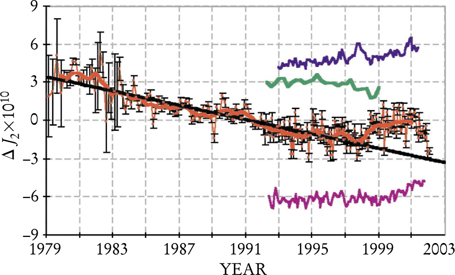 Changes in Earth’s oblateness since 1979. ΔJ 2 is the oblateness after subtraction of the mean, tide-free value and removal of atmospheric and seasonal effects. The downward slope of 2.8 × 10−11 per year was interrupted around 1998 by an abrupt increase. The thin red line connects the monthly data points, and the thick red line is a running average. The black line shows a weighted fit to the data before 1997. The offset green curve is the value of ΔJ 2 estimated to be caused by polar-ice melting, as inferred from satellite altimetry data. The blue and purple curves depict values of ΔJ 2 expected to result from ocean redistributions, as inferred from sea-level change that is either uniform (blue) or geographically distributed (purple), but not corrected for thermal expansion.
