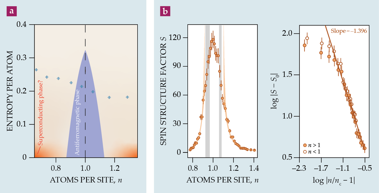 Exploring the phase diagram of the 3D fermionic Hubbard model. (a) The blue dots show the entropy per atom that researchers could achieve as a function of the atom density n. The experiment could probe the phase transition into and out of the antiferromagnetic phase, but reaching the putative superconducting phase will require cooling the system much further. (b) Near n = 1, the spin structure factor S is large. Outside of the antiferromagnetic phase, whose boundaries nc are estimated to be somewhere in the gray bands, S decays with a power-law dependence. As shown in the log–log plot on the right, the power-law scaling is consistent with the expected critical exponent, 1.396. (Adapted from ref.
