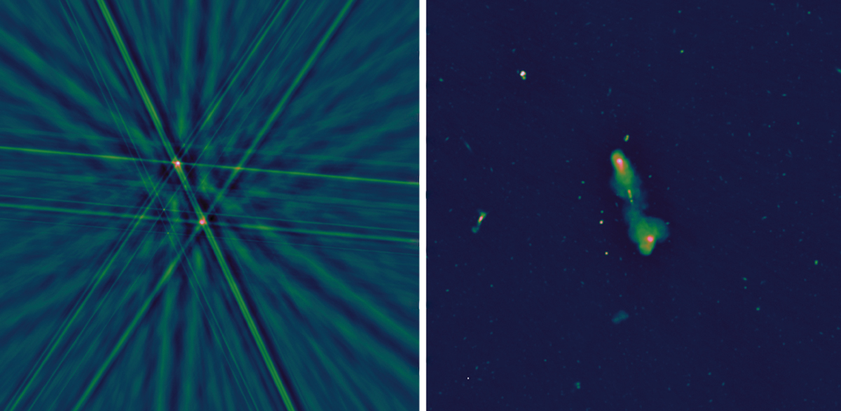 A radio camera. At facilities such as the Very Large Array in New Mexico, raw data (simulated at left) need significant processing to generate useful images. In contrast, the raw data collected by the Deep Synoptic Array-2000 (simulated at right) would require less processing, and images would be generated in real time. (Images from the DSA team.)