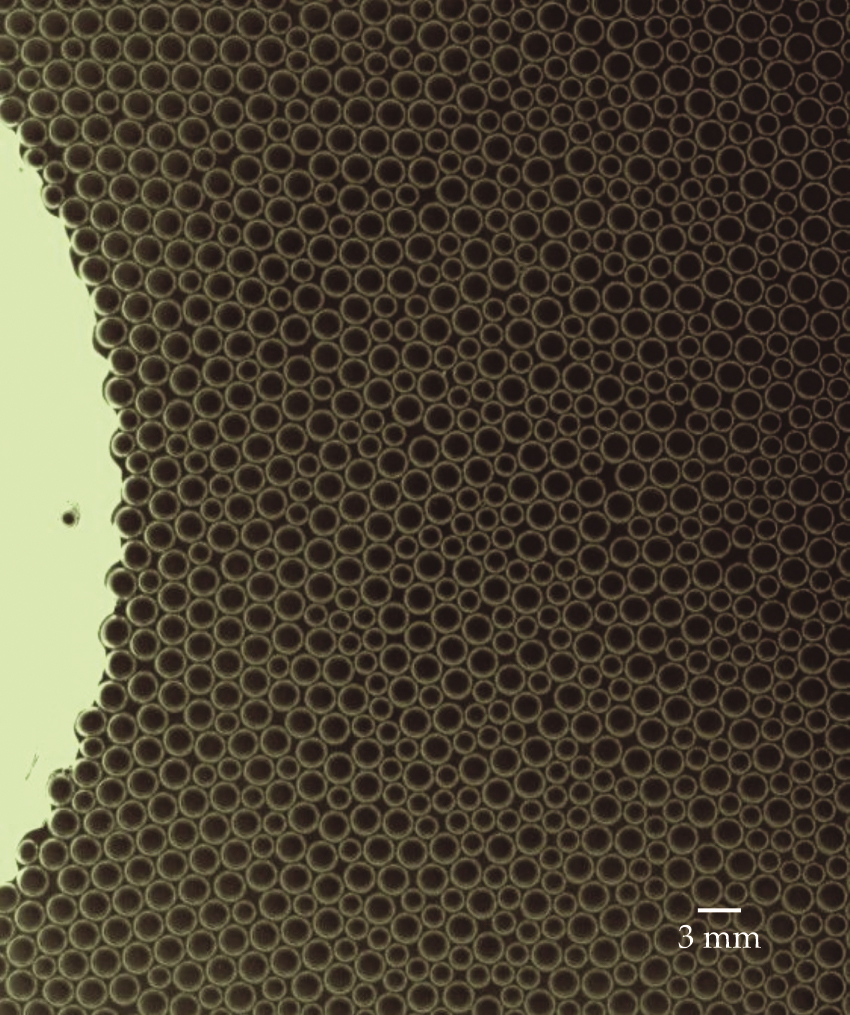 A bubble raft in a Couette cell. Although the disordered arrangement of bubbles appears random, it contains information about shearing amplitudes the raft has experienced. (Courtesy of Rajesh Ganapathy.)