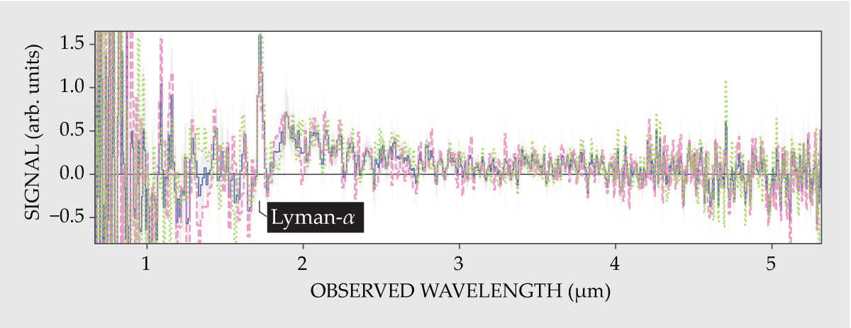 What was completely unexpected, however, was that at the Lyman-α wavelength itself, the spectrum showed a sharp, intense peak. If the galaxy had been surrounded by a neutral IGM, such an emission would have been immediately absorbed and would never have reached Earth. For a z = 13 galaxy to exhibit the spectrum that the researchers observed, it would have to have been surrounded by a sizable reionized region so that its light would not have encountered any neutral IGM until its Lyman-α emission spike was safely redshifted out of reach.