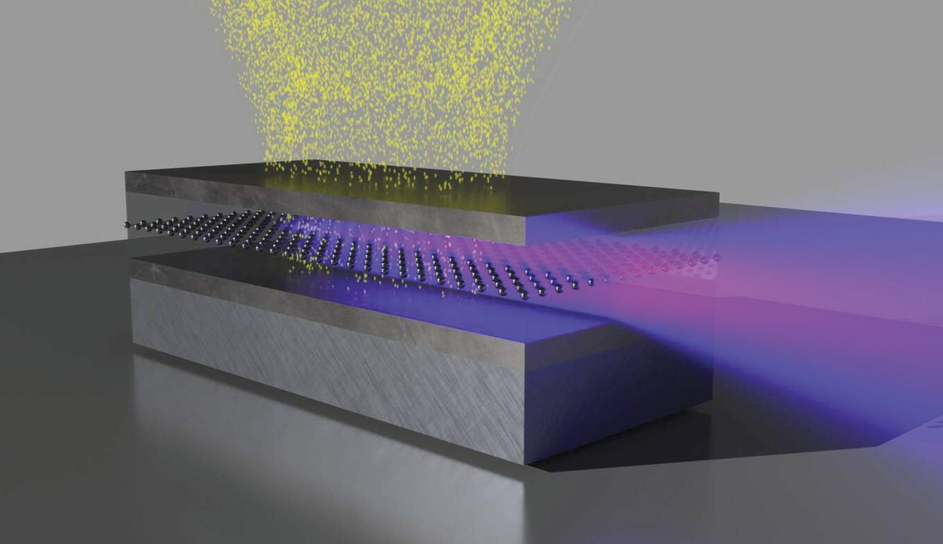 Metal atoms in a thin film become excited and generate x rays (purple) when electrons (yellow) bombard a layered waveguide structure (gray) in this artist’s impression. The x rays emerge from the end of the structure in a beam of spatially coherent light. (Courtesy of University of Göttingen/Julius Hilbig.)