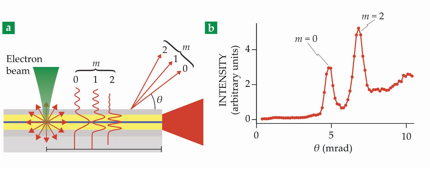 X-ray generation in waveguides produces spatially coherent light. (a) An electron beam (green) impinges upon a planar waveguide consisting of cladding (gray) and guiding (yellow) layers and a central fluorescent metal layer (blue). The electron impact excites metal atoms, which directly emit x rays (red arrows) into waveguide modes (red wavy lines) with mode numbers m. The x rays exit the channel through the cladding at angle θ with respect to the waveguide or out the end. (b) Detected far-field emission of the x rays that leave through the top of the waveguide at angle θ shows sharp peaks corresponding to the waveguide modes, m. (Adapted from ref.
