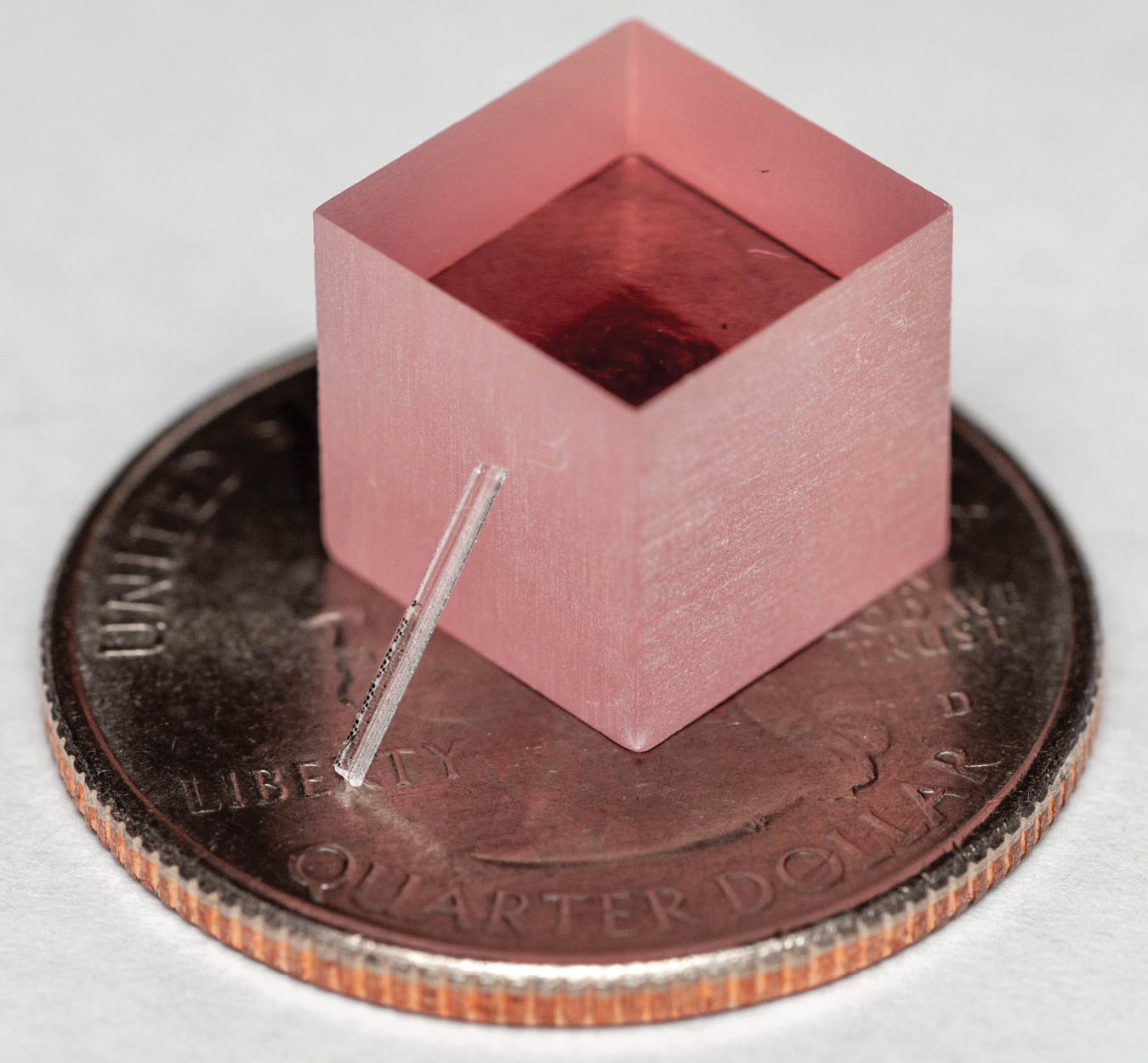 A sapphire rod holds a whole array of mini lasers, seen here leaning against a titanium:sapphire block. The mini lasers, each with up to milliwatt output power, are better for applications that require simultaneous control of many emitters at disparate frequencies. (Adapted from ref 1.)