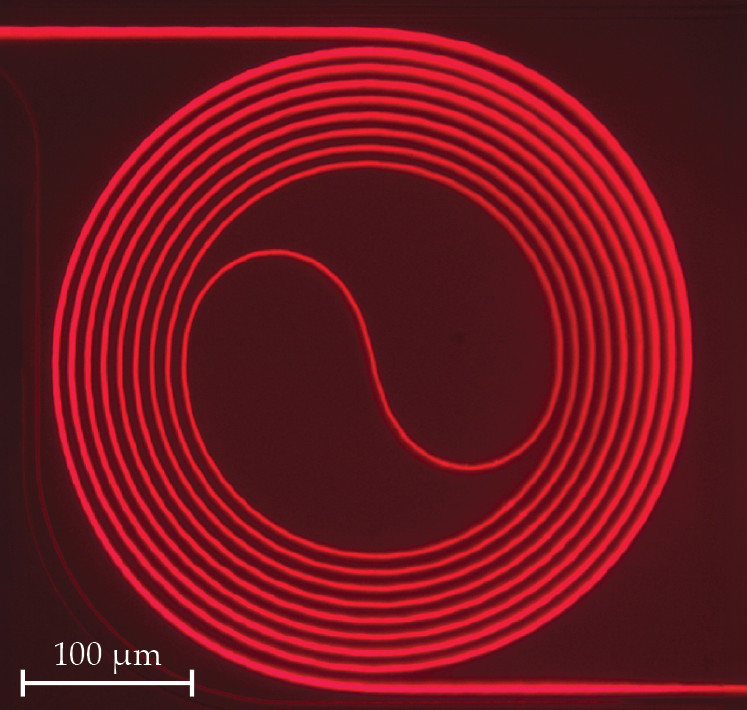 Once the Ti:sapphire layer is thinned, it needs to be etched to create a waveguide, illustrated in figure 2, that serves as the laser cavity. The spiral waveguide, seen in figure 3, keeps the light inside the lasing medium for longer, thereby amplifying the light, than if the light had taken a straight path. Sapphire’s hardness makes waveguide etching a difficult and often long process. So the researchers developed a pattern-transfer method that uses an electron-beam photoresist and a chromium mask that can withstand the lithography process.