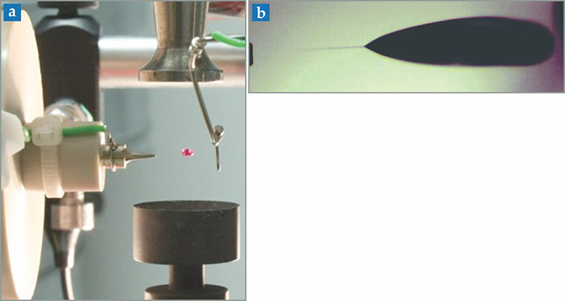 In their demonstration, the BAM chemists used high-speed photography and mass spectrometry to image the rupture and chemically analyze the progeny of a methanol droplet roughly 2 mm in diameter. They found that the r−1/2 dependence on the critical threshold field at which fission occurs is still valid at the millimeter scale, says Riedel. More importantly, the demonstration sets the stage for studies on the effects of a droplet’s size, charge, and pH on the jet it emits. In preparation, Riedel and Warschat are currently building a controlled humidity chamber. Inside, a droplet’s size will be an easily tunable knob and its lifetime effectively infinite.