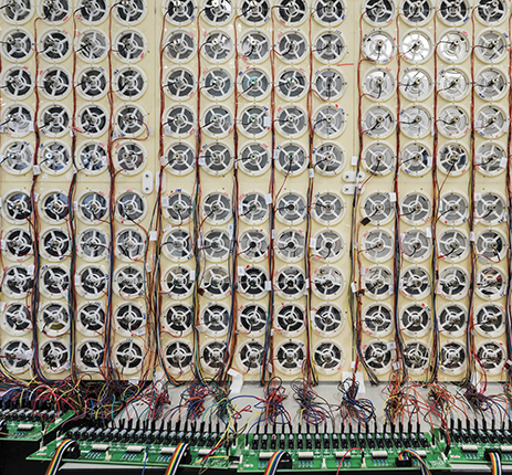 The team built an array of 360 membranes and positioned it in the middle of a room. Four membrane units were grouped together as one unit, controlled by programmable electronics. Team members measured the sound amplitude with a small microphone placed at a fixed point. The measurements provided feedback to a control system that determined which membranes should be activated to yield an acoustic wave having the smallest amplitude at the location of the microphone.