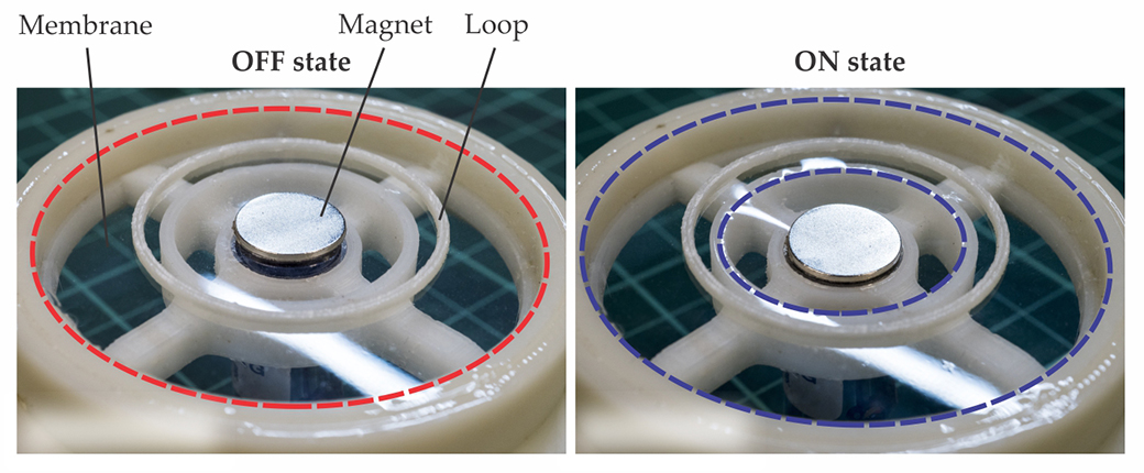 Membrane ON and OFF states. Each acoustic metasurface membrane, to which a magnet has been attached, can be electrically switched between two states by changing the polarity of the voltage across an electromagnet, which sits beneath the white frame in these photos. In the OFF state, the magnet is free and the transparent membrane has one fixed boundary at the edge (red circle). In the ON state, the magnet is snapped onto the electromagnet and the membrane has two fixed boundaries (blue circles). The loop just outside the inner boundary is part of the electromagnet’s support. (Adapted from ref.