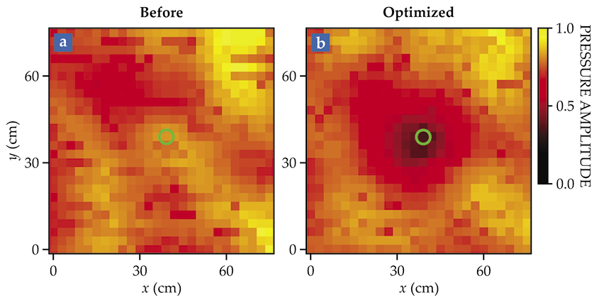 Says Fink, “In our case, the spatial properties of the metasurface can be changed in real time to maximize energy in some location or to create a silent zone. This makes them quite attractive for various applications.” Creating quiet zones anywhere in a room could provide a versatile noise-abatement solution, and creating acoustic hot spots at positions with high absorption could reduce the average sound level in a room.