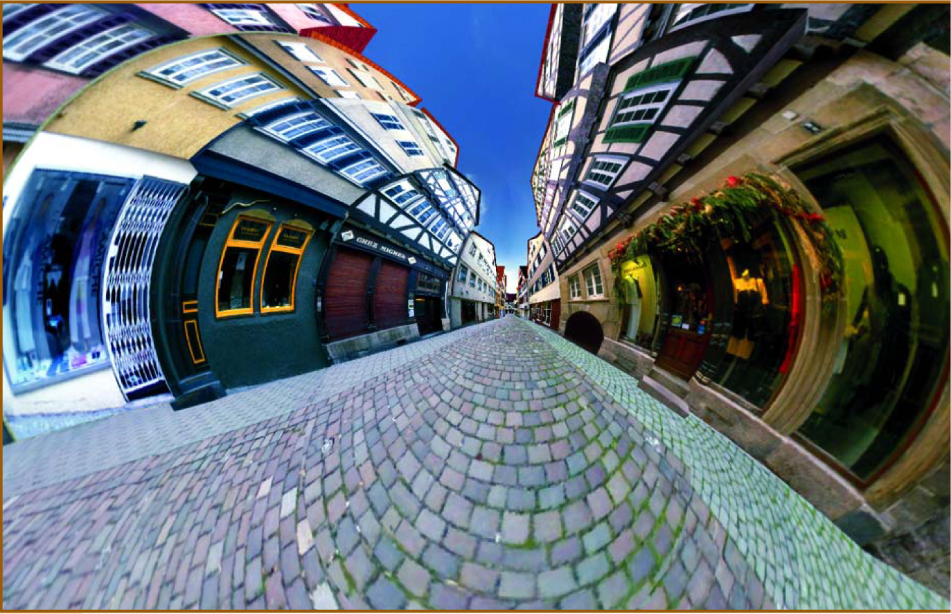 Relativistic tourism: Zipping down this street in Tübingen, Germany, at close to the speed of light, objects in front appear to be more distant than they are; objects behind are still in view; and objects up close appear deformed. (Simulation created by Marc Borchers and the Department of Theoretical Astrophysics, Tübingen University, using a 3D computer model from the Max Planck Institute for Biological Cybernetics, Tübingen.)