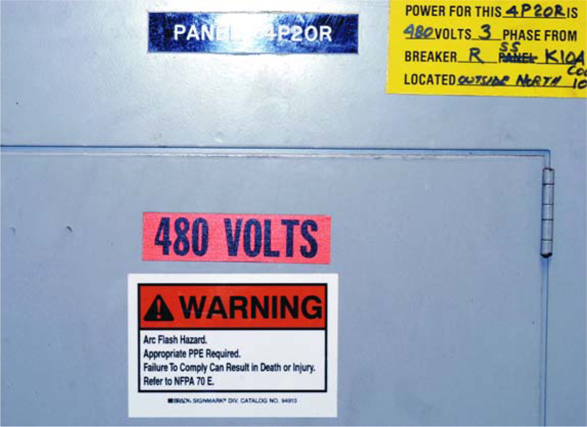 Cover of the electrical panel at which the 11 October accident occurred in the klystron gallery at SLAC. Despite its warning labels (PPE means personal protective equipment), the 480-volt panel was energized when the electrician was installing a circuit breaker, and he was not wearing fire-retardant clothing.