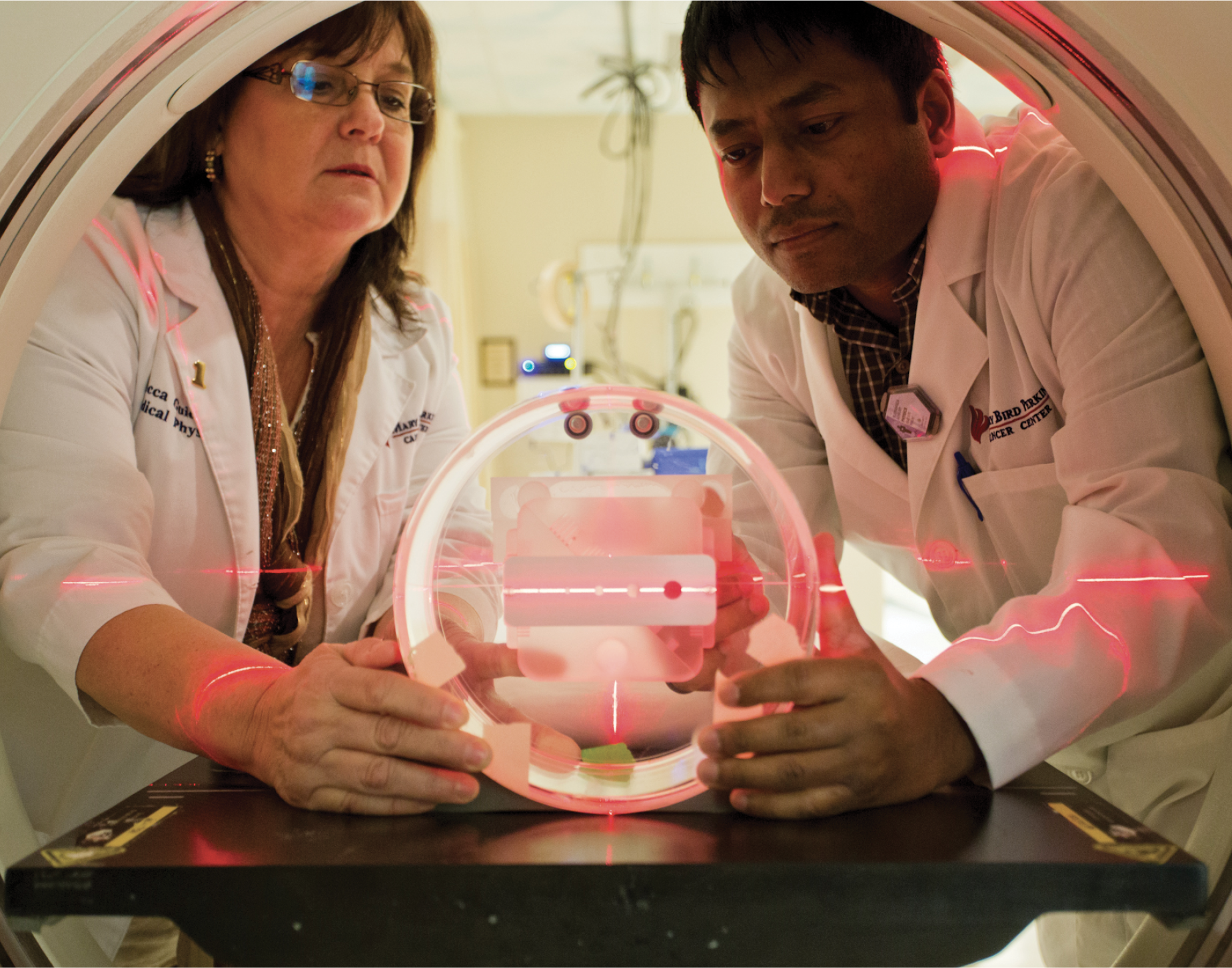 Medical physicist Becky Guidry (left), of the Mary Bird Perkins Cancer Center in Baton Rouge, Louisiana, shows trainee Bijoyananda Adhikary how to work with a quality assurance device being used on a diagnostic CT scanner. The images taken by this CT scanner will help in planning computer-optimized radiation therapy that employs x rays or electrons.