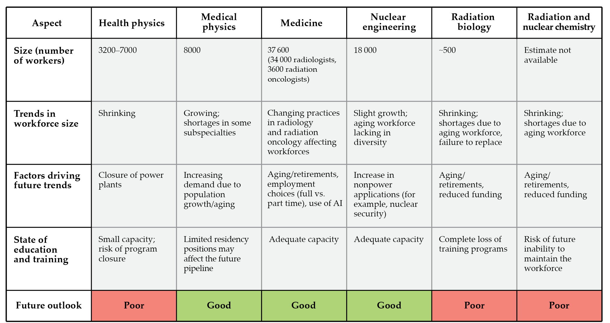 A summary of the workforce health of the radiation professions shows several with worker shortages and declines in the number of education and training programs. (Adapted from W. D. Newhauser et al., J. Appl. Clin. Med. Phys. 23, e13846, 2022