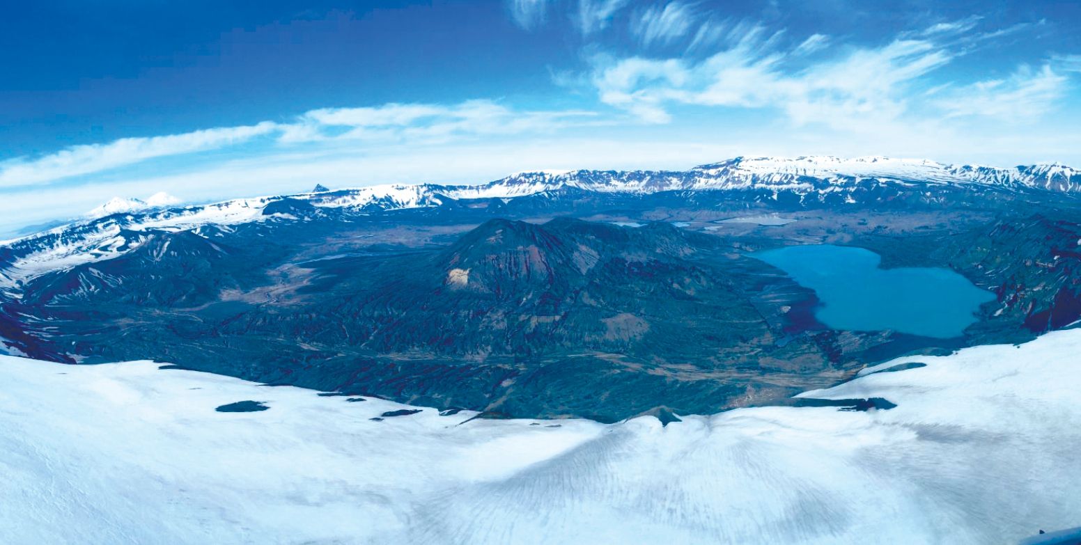 The 10-km-wide caldera on Alaska’s Umnak Island was formed during the 43 BCE eruption of the Okmok volcano. The massive eruption produced some of the most extreme Northern Hemisphere weather conditions of the past 2500 years. (Courtesy of Kerry Key, Columbia University.)
