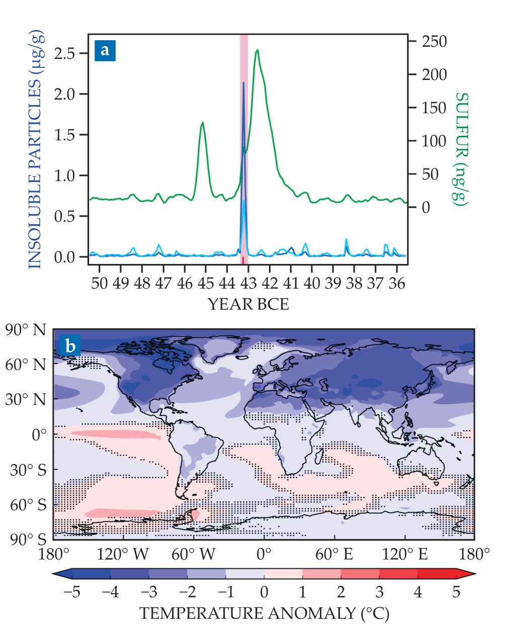 Ice-core and climate analyses. (a) Continuous mass spectrometry of sulfur and insoluble-particle (tephra) concentrations—in units of nanograms and micrograms of material per gram of water, respectively—synced to the years that volcanic fallout settled into snow. (b) This snapshot of an air- temperature simulation captures the average air-temperature anomalies during 43 and 42 BCE. As inputs, the researchers relied on the Okmok eruption’s location, timing, and sulfur yield to estimate its cooling effect and the extent and persistence of the climate response into the late 30s BCE. (Adapted from ref.