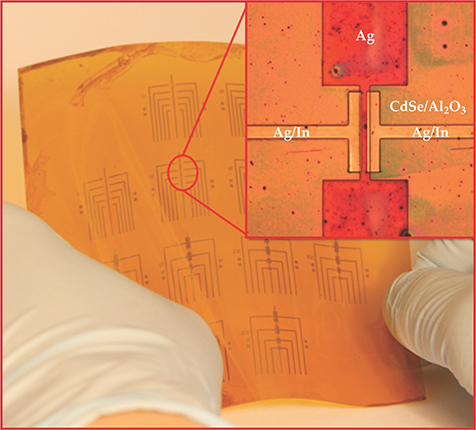 Figure 1. An array of all-nanocrystal field-effect transistors fabricated on Kapton, a commercially available plastic commonly used for printed circuits. The inset shows the details of one FET. The horizontal distance separating the source and drain electrodes (silver/indium) is 30 μm. Viewed here from above, the silver gate electrode is visible although it lies beneath the thin cadmium selenide semiconductor-channel and aluminum oxide insulator layers. (Adapted from ref.