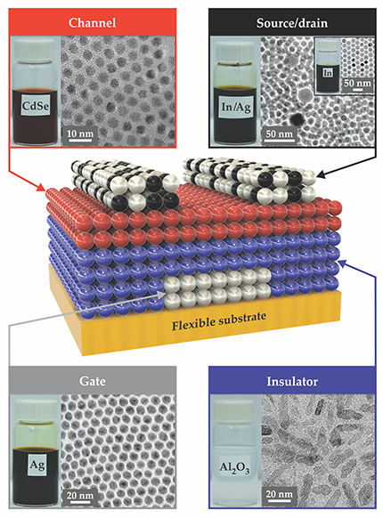 Researchers have long known that nanocrystals can exhibit tunable properties based on their size, shape, and composition. For example, quantum-confinement effects are routinely exploited in semiconducting nanocrystals, better known as quantum dots, to control their size-dependent bandgaps. Thus, different nanocrystals could be tailored to serve as the different components of a FET. Says Kagan, “We wanted to see if we could design the materials, interfaces, and processes to put the pieces together.”