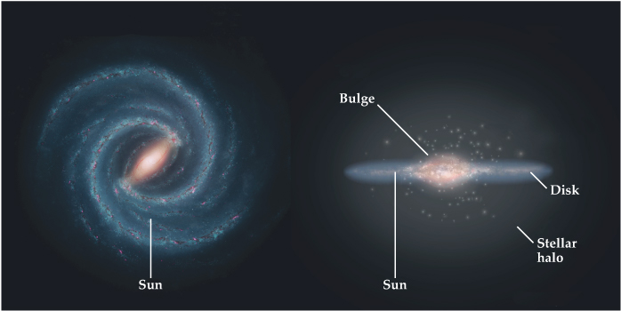 The structure of the Milky Way galaxy. The Sun is about 8 kiloparsecs (about 26 000 light-years) from the galactic center. The disk is composed of a thin component surrounded by a thick component. The halo, a diffuse sphere of stars, envelops the galactic disk. (Left image by NASA/JPL-Caltech; right, ESA; layout, ESA/ATG medialab.)