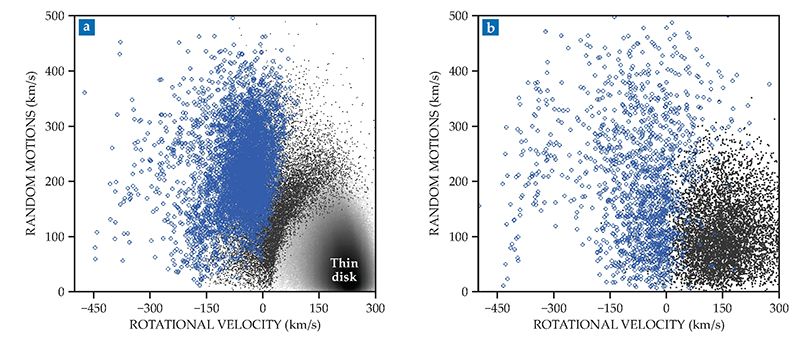 Velocity distribution of stars in the Sun’s vicinity reveals two populations of different origin. (a) Velocity components of stars that are within 2.5 kiloparsecs (about 8200 light-years) of the Sun. Blue dots represent halo stars with predominantly retrograde orbits; black dots, halo stars without retrograde orbits and stars in the galactic disk. (b) Velocity components inferred from a simulation of a merger that formed the galactic disk. (Adapted from ref.