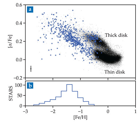 Chemical abundances of stars in the Sun’s vicinity reflect their origin. In (a), the same sample of stars from figure