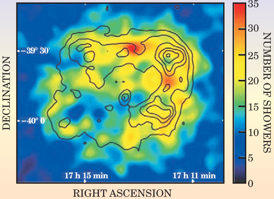 Figure 1. Gamma-ray image of the supernova remnant RX J1713.7–3946 obtained with the Cherenkov telescopes of the new High Energy Stereoscopic System (HESS). The color key indicates the number of recorded gamma showers per unit circle of radius 5 arcminutes, the resolution of this image. The incident energies of the gammas whose showers were used to make the image ranged from 0.8–10 TeV. The contour lines represent the keV x-ray brightness of the remnant as measured by Japan’s ASCA satellite.