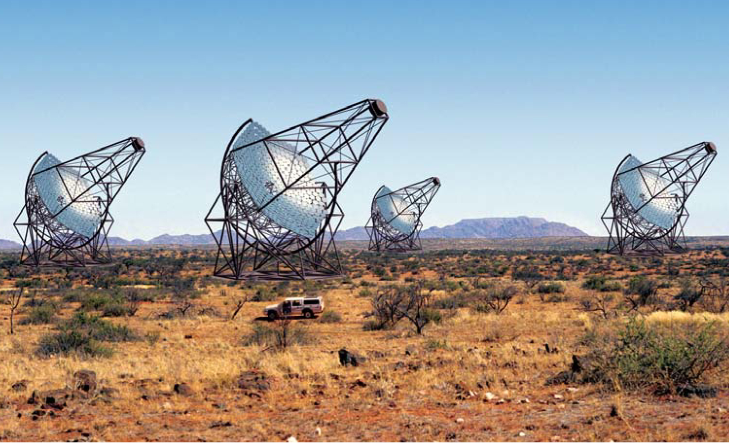 Figure 2. The four Cherenkov telescopes of the recently completed HESS facility sitting at an altitude of 1.8 km in Namibia’s Khoma Highland. Each telescope’s segmented 13-meter-diameter parabolic reflector directs the flash of Cherenkov light from an incident high-energy cosmic-ray shower onto the focal-plane array of phototubes that serves as its high-speed camera.