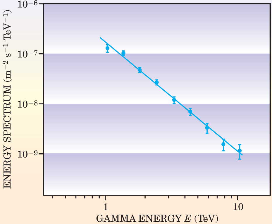 Figure 3. Gamma energy spectrum of the supernova remnant RX J1713.7–3946 as measured by the HESS Cherenkov telescopes. Below 1 TeV, distinguishing the rare cosmic-ray showers initiated by gammas from the much larger background of proton-induced showers becomes increasingly difficult. Above 10 TeV, short exposures run out of showers. The line represents the best power-law (E−P) fit to the data, giving P = 2.19 ± 0.2.
