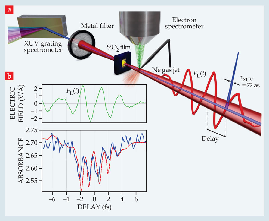 Figure 2. Attosecond spectroscopy of silica reveals modulations in the amount of extreme UV (XUV) radiation silica absorbs as a pulse of visible light passes through it. (a) Just 72 attoseconds in duration, the XUV pulse (blue) is far shorter than the light pulse (red) and can be delayed by a controllable amount to monitor the absorption at different instants in the light’s waveform. Both pulses travel from right to left. Some of the XUV photons excite a neon gas jet whose spray of photoelectrons can be used to map the light’s electric field as a function of delay (see Physics Today,