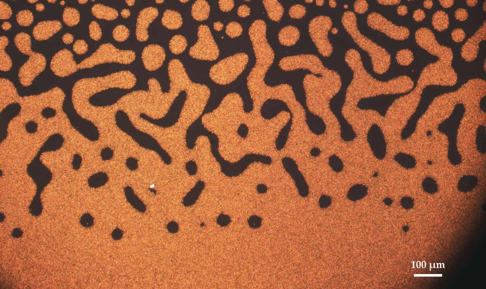 The material displayed several types of macroscale behavior reminiscent of a conventional fluid with positive surface tension. Nearby clusters of spinning particles merged into larger droplets. When the glass slide was tilted, the droplets bumped up against a hard edge and spread out, like raindrops on a windshield joining and then flattening when they hit the frame. When an obstacle was removed from the bulk, the voids quickly filled, like bubbles collapsing.