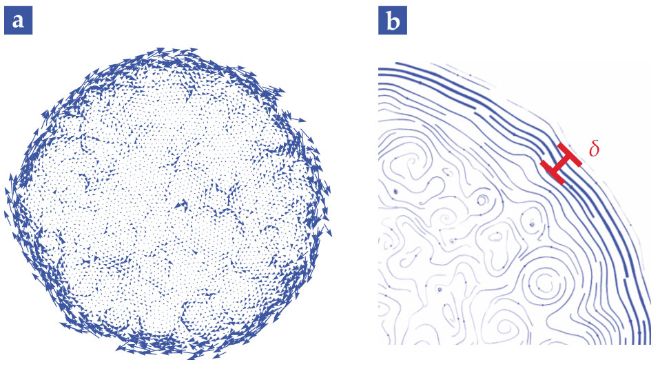 Measuring the velocity of each particle provides a flow profile (a) of a droplet of diameter 100 μm. (b) The flow is concentrated at the edge of the droplet in a layer of depth δ (4.5 μm). (Adapted from ref. 1.)
