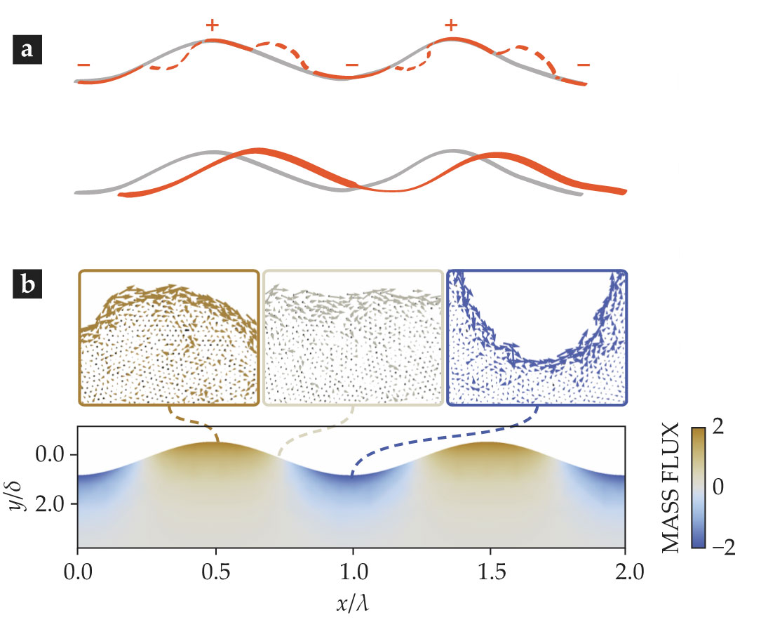 “The best way to think of the wave propagation mechanism is to think of the wave in terms of mass flux,” says Irvine. A chiral fluid always has an edge current, and a 2D droplet or a perturbed flat interface always has some nonzero curvature. The value of vorticity, the local spinning motion, is increased at regions of positive curvature (wave crests) and gives rise to enhanced mass flux relative to the average mass flux. Similarly, vorticity is decreased at regions of negative curvature (wave troughs) and gives rise to reduced mass flux. As shown in the sketch in figure 3, that differential mass flux effectively pumps fluid toward regions of zero curvature.