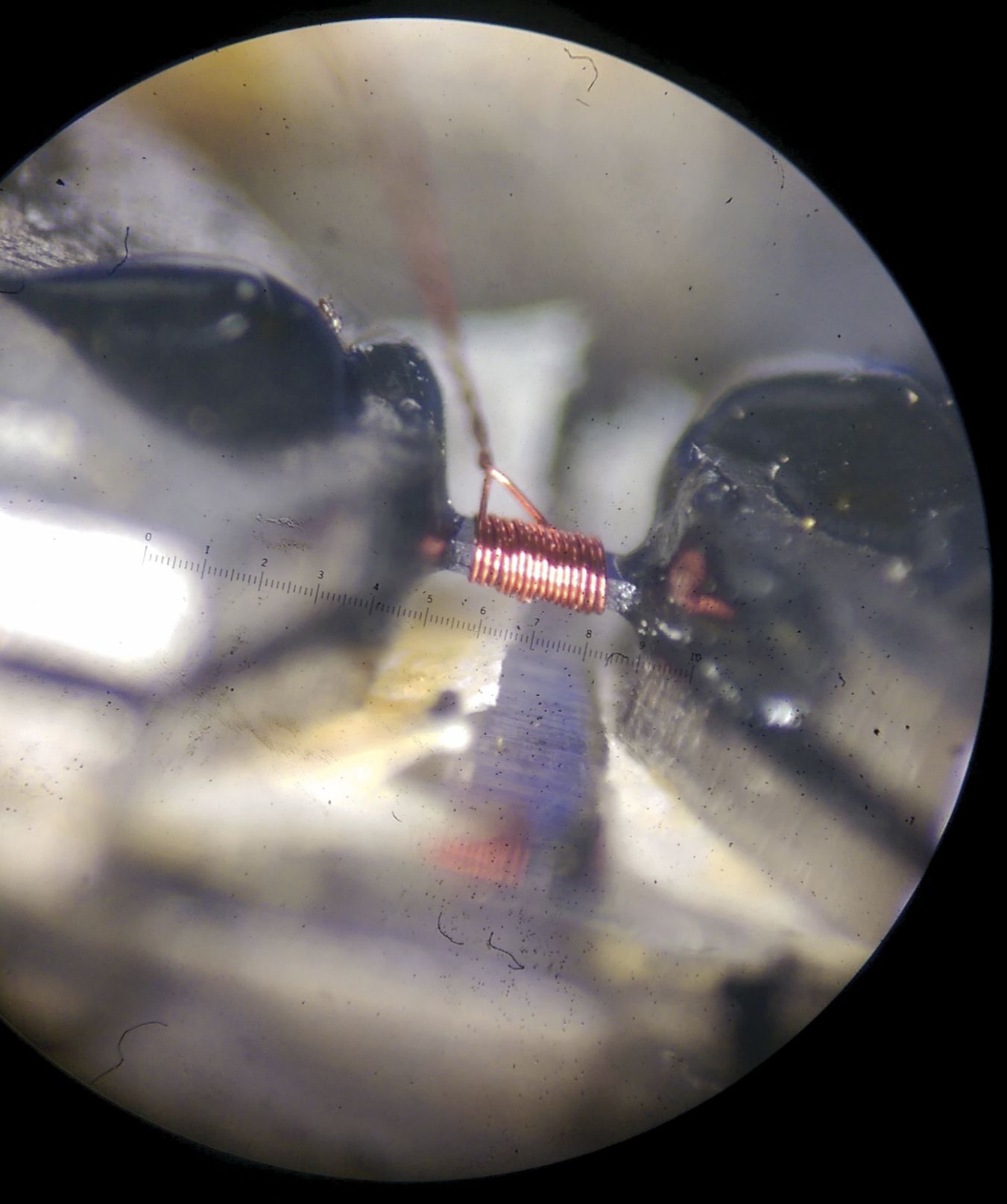 Strontium ruthenate is superconducting below a critical transition temperature of 1.5 K. Researchers explored its unconventional superconducting state by wrapping a crystalline sample in an NMR coil and observing its response to a magnetic field. The results showed no detectable magnetic response from the superconducting condensate. That finding rules out previously postulated theories of odd-parity superconductivity in which paired electrons have the same spin. (Courtesy of Andrej Pustogow.)