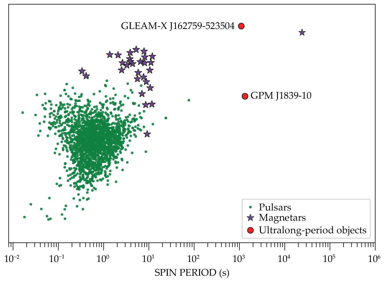 The ultralong emission periods of stars GPM J1839-10 and GLEAM-X J1627 stand out from the cluster of typical neutron stars—pulsars (long-lasting stars with pulsating emission; green circles) and magnetars (characterized by a tangled magnetic field; purple stars). Pulsar periods typically fall between 1 ms and 12 s; magnetar periods typically fall between 2 and 10 s. In addition to GPM J1839-10 and GLEAM-X J1627, only a handful of other astrophysical objects display long periods. Collectively they may be part of a yet-unclassified group of objects. (Data from ref. 2.)