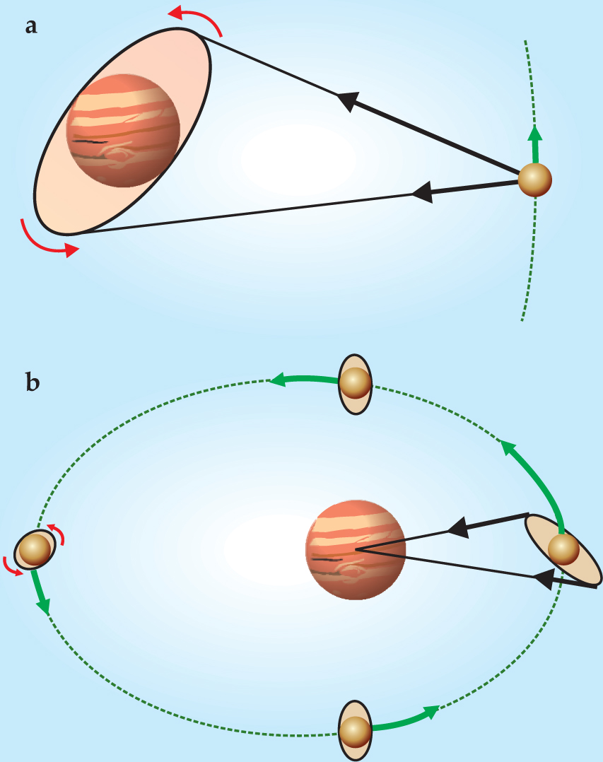 Tides in Jupiter and its innermost large moon, Io, have opposite effects on Io’s orbit. (a) Io’s gravity creates a tidal bulge in Jupiter, which is pushed by Jupiter’s rotation (red arrows) ahead of the lo–Jupiter line. Gravitational interaction (black arrows) between Io and the bulge slows Jupiter’s rotation and increases Io’s orbital energy. (b) Jupiter also creates a tidal bulge in Io. Because Io has an elliptical orbit, its instantaneous orbital speed varies (green arrows). At its most distant point from Jupiter, Io rotates (red arrows) faster than it orbits, so the bulge lies slightly ahead of the Io-Jupiter line in the direction of Io’s rotation. At its nearest point to Jupiter, the opposite is true. As a result, Jupiter exerts a force on Io that diminishes Io’s orbital energy. The tidal bulges and orbit eccentricity are exaggerated for effect.
