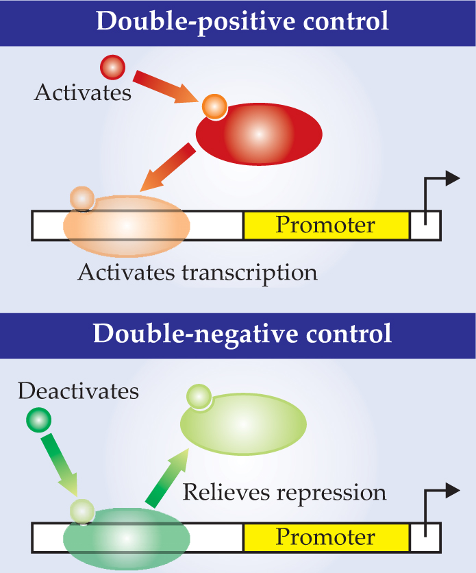 Figure 1. Gene expression, indicated here by the thin bent arrow, is triggered by the detection of a nutrient molecule in one of two ways. In double-positive control (top), the nutrient (small circle) binds to the freely floating transcription factor, enabling the TF to bind to the gene’s promoter region and flag the gene for expression. In double-negative control (bottom), a TF is already bound. It blocks gene expression until a nutrient molecule binds to the TF, causing it to detach from the DNA and flag the gene for expression.