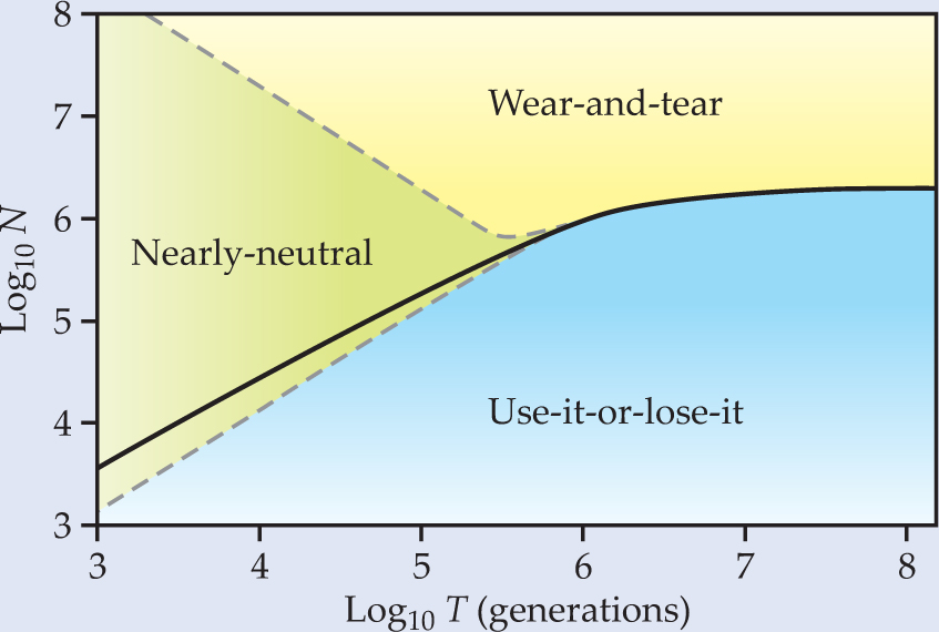 Figure 2. The phase diagram indicates when one of two evolutionary principles, use-it-or-lose-it or wear-and-tear, prevails in the choice of transcription control. Above the solid line, wear-and-tear is the winner; below the solid line, use-it-or-lose-it. At small generation number, the outcome is nearly neutral. However, use-it-or-lose-it cedes a smaller portion to the nearly neutral region than wear-and-tear and is therefore more generally predominant.