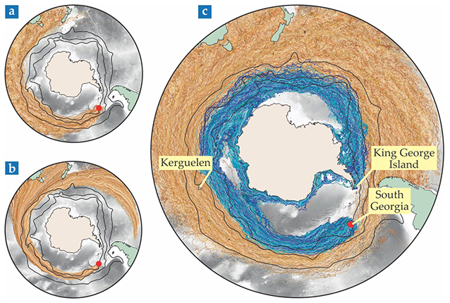 Ocean-circulation simulations test whether passively floating material can travel from the Atlantic island of South Georgia to Antarctica. Brown trajectories represent simulated particles that don’t reach Antarctica; blue trajectories represent ones that do. The three panels show the results of simulations that incorporate (a) eddies but not Stokes drift, (b) Stokes drift but not eddies, and (c) both eddies and Stokes drift. (Adapted from ref.