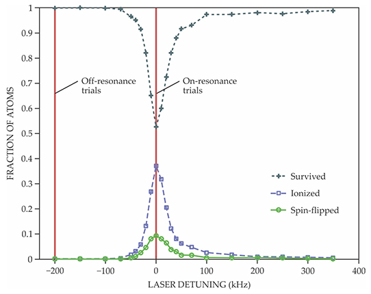 Figure 2. Simulated results of an antihydrogen spectroscopic experiment. Atoms that are excited by the laser may be ionized or spin-flipped and thus lost from the trap. So far, the ALPHA experiment has tested two values of the laser detuning, as marked by the red lines. The results for atoms remaining in and escaping from the trap are consistent with the simulation. (Adapted from ref.