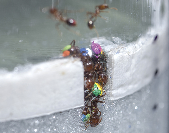 Fire ants excavating a tunnel. The ants, painted different colors for identification, dig along the wall of a transparent container filled with 0.25-mm-diameter glass particles. (Photo courtesy of Rob Felt, Georgia Tech.)