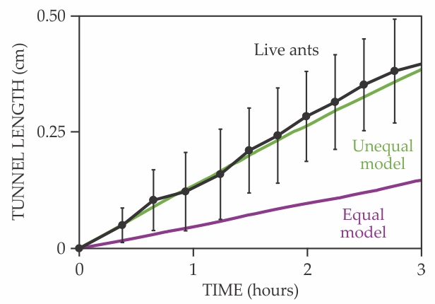 Goldman’s student William Savoie demonstrated that the simulated ants moved at maximum efficiency, without jamming, when following an optimized division of labor similar to that observed in the biological experiments. Simulated ants that used an equal division of labor increased tunnel occupancy with an increasing number of ants, and thus exhibited optimal flow for only a few population sizes. The excavated tunnel lengths over time for experiments and simulations are shown in figure
