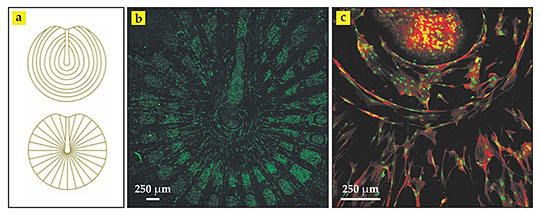 In one scaffold design, the researchers constructed the circumferential rings and radial spokes by combining the two patterns into a single grid layer and then covering it with electrospun mesh to form a bilayer structure. In a second, more complicated design, they constructed the patterns as two separate grids with electrospun mesh sandwiched between them—a trilayer structure. As proof of feasibility, they seeded both types of scaffold with stem cells taken from bone marrow. Within eight days of bathing the scaffolds in a culture medium, networks of cells, precursors to collagen, appeared to thrive. Panels b and c of the figure show the cells’ growth and proliferation for the simpler design, as revealed by confocal laser microscopy.