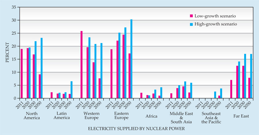 The International Atomic Energy Agency sees a wide range in nuclear energy’s potential share of total electricity generation in the coming decades.