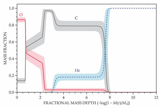 The chemical profile of the white dwarf KIC 08626021, revealed by asteroseismology. Roughly half the mass of our sun, the star is oxygen- and carbon-rich at its center and helium-rich at its periphery, in agreement with stellar evolution theory. (Radial distance increases with fractional mass depth.) But the oxygen mass fraction—more than 85% at the stellar center—is too large to be accounted for by current theories. Here, M* is the white dwarf’s mass, M(r) is the mass within radius r, and shaded regions correspond to 1σ confidence intervals. (Adapted from ref.
