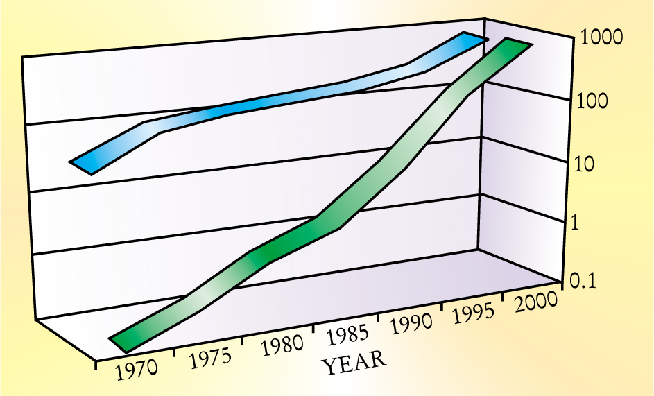 The number of pixels in chargecoupled device cameras grew 3000-fold from 1975 to 2000 (green band, in megapixels). Over the same period, the total area of ground-based telescopes 3 meters in diameter or larger increased by a factor of 30 (blue band, in meters squared).