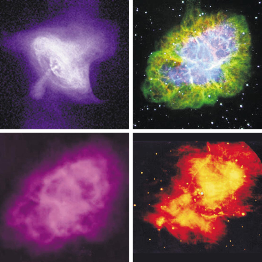 Comparing images of the Crab Nebula in (clockwise from upper left, not to scale) x-ray, optical, infrared, and radio wavelengths reveals that the most energetic radiation comes from the pulsar, or rapidly spinning neutron star, at the center. As electrons from the pulsar move away and lose energy with time, they radiate longer wavelengths, with radio waves defining the full extent of the nebula.