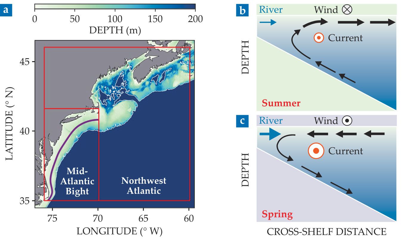 Off the east coast of North America, the continental shelves of the Northwest Atlantic and the Mid-Atlantic Bight (a) are affected by seasonal wind, river, and current patterns. In the summer (b), the southwestward current (orange, out of page) is modest and wind-driven surface waters (black arrows) flow away from the shore. But in the spring (c), the current is stronger and surface waters flow toward the shore. When shellfish spawn too early in the year, their larvae are thus swept into warmer, shallower waters. (Adapted from ref. 1.)