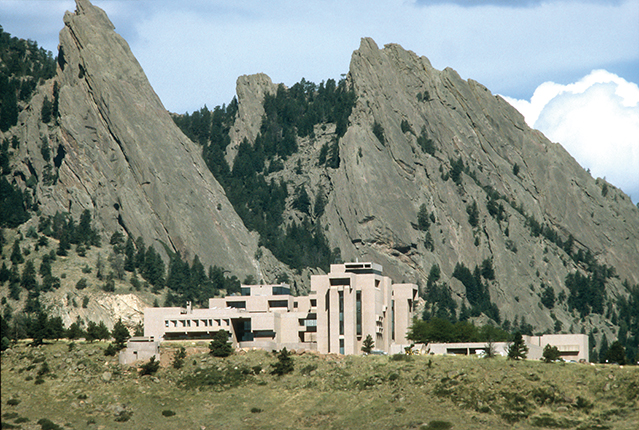 The Mesa Laboratory of the National Center for Atmospheric Research is located in Boulder, Colorado, against the backdrop of the monolithic sandstone slabs called the Flatirons.