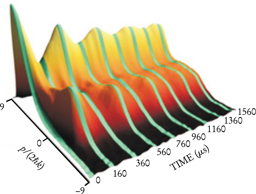 Figure 3. Momentum distribution of a Bose–Einstein condensate oscillating within the wells of an optical lattice. The diffraction peaks result from interference between atoms from different wells. Sampled after 0.25 (front), 2.25 (middle), and 5.25 (back) modulation periods, the distributions show the evolution from a negative momentum to a positive momentum state.